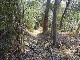 | 1郭下の腰曲輪。南側部分。ここだけ笹が切ってある。 | 腰曲輪から2の方向へと降りていく通路。 |