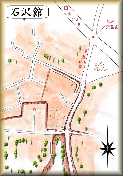 国道118号線と県道168号線とが交差する石沢交差点の南西150mほどの一帯が石沢館の跡と思われる箇所である。