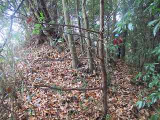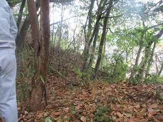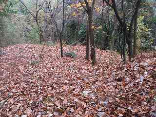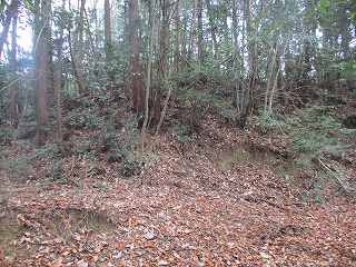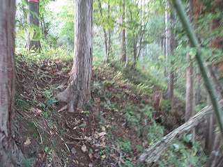 | 墓地の上に登って行くと、最初に見えてくる帯曲輪。 | その先にある小さな堀切。 |