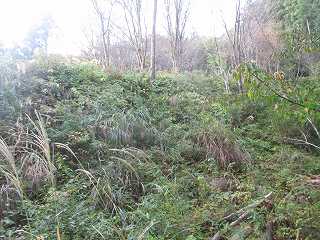 | テラス状郭の一番下の段から西出城の山頂方向を見上げる。 | 西出城の南側下にある横堀。かなり埋まっているが横堀と見てよいだろう。横堀は2段になっている。 |