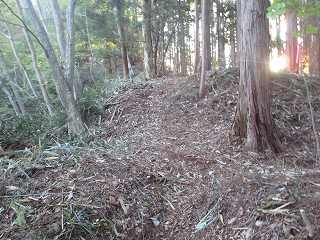 堀切から北側に尾根は続いている。そちらへ進んで行くと、尾根のすぐ先に小規模な堀切が掘られていた。さらにその先に進んで行くと尾根は登りになり、登り切って平坦になった部分の先にも小規模な堀切が見えてきた。この堀切が城域を区画するものだったようである。