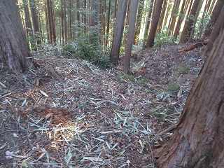 登って行くと帯曲輪状のものは合計6本ほどあった。しかし、いずれも加工は甘く、幅もそれほどないので、居住性のある空間とはなっていない。切岸加工のために生じたものといった程度のものである。