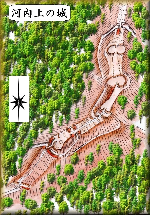 上の城は、河内城から山稜を400mほど登って行った所にある。河内城からの比高差は60mほどであるが、それほど急峻な斜面ではなく、比較的歩きやすいルートとなっている。