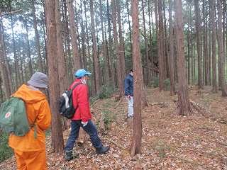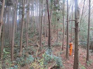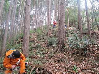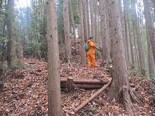 神社の脇から背後の山稜にかけて作業林道のようなものが付けられている。なんでも山中でかつてシイタケ栽培がおこなわれていたということで、山の中腹まで作業道がいくつも付けられているのはそのためである。というわけで、中腹までは、この作業道を通って行けば簡単に登って行くことができるようになっている。