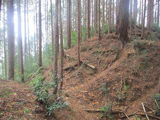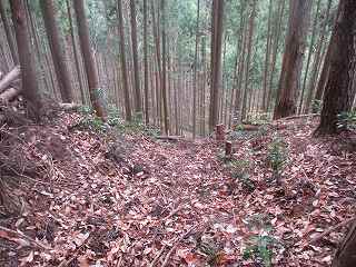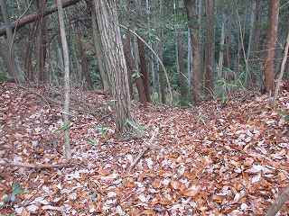 そこから尾根は北側に向かって降って行くが、この方向には3本の堀切が構築されている。これらの堀切の存在からして、城郭遺構と見て間違いなさそうである。