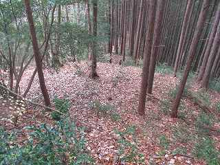 再び1郭まで戻ってくる。1郭から西側の斜面を降りていくと、その下にもテラス状の郭が造成されていた。南端部には堀切を入れている。西側の尾根からアクセスする敵を監視するための小郭だったようである。