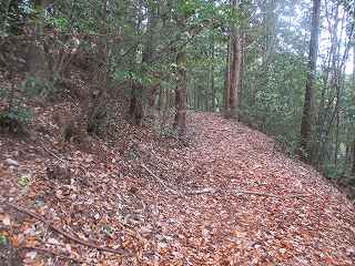 | 南出城の帯曲輪。 | 南出城から尾根を登って行くと、1郭下の腰曲輪と城塁に到達する。 |