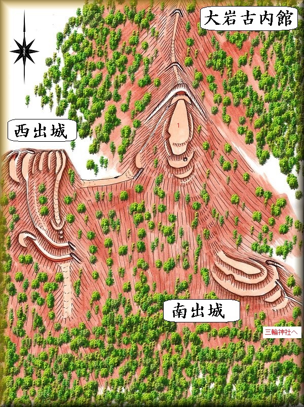 大岩古内館は、大岩地区の三輪神社の背後にそびえる比高100mほどの山稜に築かれている。したがって三輪神社を目指していけばよい(この三輪神社は昭文社の地図では大岩神社として掲載されている。)。