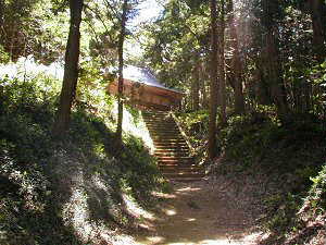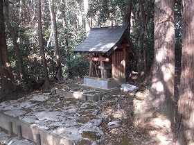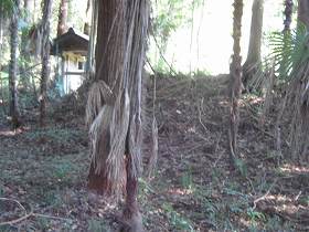 | 西方から見た根当要害。比高10mほどの台地先端部に当たる。 | 城内に祭られている八幡神社。 |