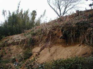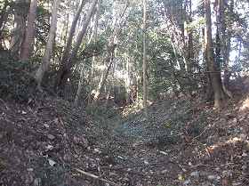 南側の城域は分かりにくいが、台地の北端部分は、写真のような削られた崖となり、また台地への上がり口は、切通しの道となっている。この切通しの北東側が主郭部ではないかと思われる。台地の比高は10mほどである。