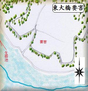 東大橋要害は、香取神社の南西500mほどの所にある。西の生板池から東南に流れている小川があるが、この小川は北側の台地沿いにぐるりと半円を描くように流れていく。この部分の、台地が南に突き出した先端部が要害であったらしい。台地の比高は5、6mほどである。台地上は一面の広大な畑となっている。どうやら耕地整理によって、遺構はすっかり失われてしまったようだ。しかし、どこかに何かがあるかもしれない、と思って、先端部近くの林の中に入ってみた。すると平地の先が段になっているところがある。もしかすると、これも耕地整理の際に生じたものであるのかもしれないが、郭の端であった名残である可能性もある。