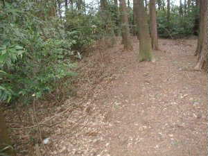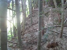 円墳部分の西側下には横堀状の部分が見られる。これも、切岸加工を施した際に生じたものと思われる。本来の円墳部分の底辺は、この下の横堀の土塁まで及んでいたのではないだろうか。堀そのものはそれほど深いものではないが、塹壕程度の用途にはなりそうである。