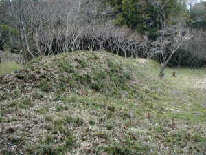 *この城址は民家の庭の奥にあるので、ここを訪問する際には、このお宅の方に許可を得てからにしてください。私はここの奥さんにお願いしたのだが、快く見学させていただいた。ありがとうございます。この古墳はけっこう有名らしく、ちょくちょく見学に来る人がいるということである。