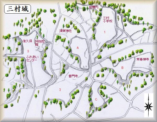 小学校の敷地になっているということもあって、明確な遺構が一部しか残っていなかったので、地形を基にしたラフ図を掲載しておくが、現地案内板では普門寺のある台地を2郭、阿弥陀院背後の台地を3郭tとしている。しかし、いくらなんでも、これではあまりにも巨大城郭すぎる。実際には三村小学校の周囲だけが城郭遺構であったのではないだろうか。