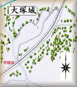 大塚城は、県道221号線「大塚十字路」の北東400mの所にある。大塚十字路のところから北上しJRの線路を渡ってすぐに右手下に細い道を降りていく。道はくねくねと曲がっていき、300mほど進んだ台地の先端辺りが城址であるという。