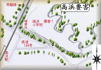 高浜要害は高浜小学校のある台地の東側にあった。台地の比高は20mほどで、切り立った崖になっている。要害と呼ばれているが、その歴史などは明らかではない。石岡城、あるいは高野浜城を守るための出城の1つであろうか。