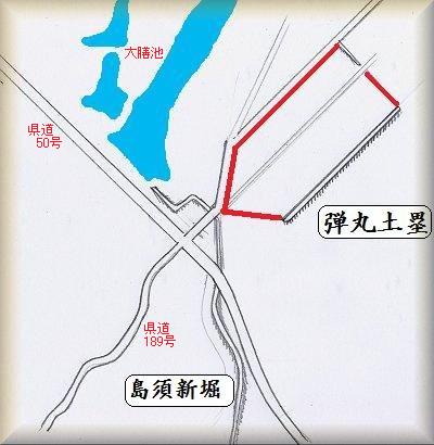 以前、石崎氏に教えていただいたものである。県道50号線と189号線とが交わる交差点の北東部に、道がややクランクしている場所がある。「明治迅速図」を見ると、その部分に弾丸の形を示すように土塁が描かれている。何のためのものだか分からないが、現在でもその土塁の一部が残っているというのである。