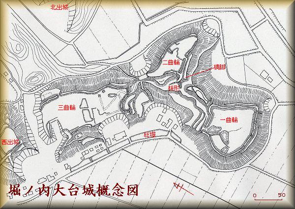 堀之内大台城は土砂の採掘によってほぼ隠滅してしまっている。そのためどんな城郭であったのかもはや知るすべもないのであるが、『堀之内大台城』という発掘調査報告書が出ているので、その測量図を基にして概念図を描き起こしてみた。