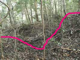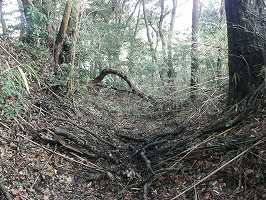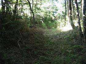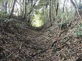 | 南側の堀切と、その外側の土塁(左側)。堀の深さは2m程度である。 | 北西角にある切り通しの虎口。後世の改変かもしれない。 |
