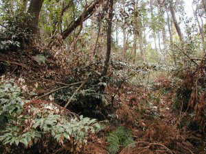 この登城道を上がると、すぐ北側に土手が見えてくる。虎口らしく見えるところもある。写真がそれなのだが、薮なのでなんだか分からない写真になってしまう。ここを上がると腰曲輪のような郭で、さらに上に壇がある。結局3段ほどの郭が梯郭式に配置されていたものらしい。