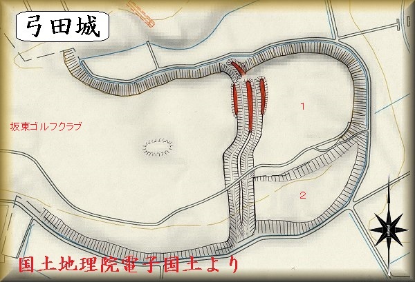 弓田城は竜ヶ谷城ともいい、県道136号線沿いの「三和フォージ」という工場の南500mほどの所にあった。東側の小川に向かって突き出した比高10m弱ほどの低い台地上である。現在この地は新東京ゴルフクラブの敷地になってしまっている。コースの中にはいくらか遺構らしきものが見られるとも言うが、確認していない。