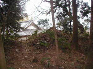 『岩間町史』の写真では、土塁がよく残っていそうに見えるのであるが、近年すっかり改変されてしまったらしい。フェンスの中には土が盛られている。裏手に回って、フェンス内が見える所まで行ってみる。隣の畑と館との間には、深さ1m、幅1、5mほどの溝が穿たれている。これはもともとの遺構ではないと思うが、空堀のように郭を取り巻いている。何のためのものなのか、不明だ。畑の用水路にでもするためのものか?