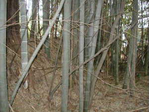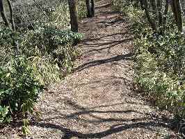 その先が3郭である。3郭は尾根を削平したものであり、かなり細長く、80m近くもある。中央部には遊歩道があるので、どんどん進んでいけるのだが、その両脇はヤブだらけである。そのため、縁部の形状がきちんと把握できていない。