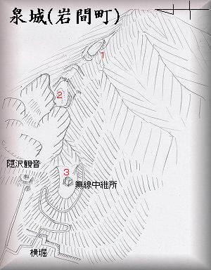 難台山の峰が南にずっと下がっていったところに標高218mの鐘転山がある。この辺りが泉城のあったところであるという。麓に隠沢観音がある山で、山の南側には平坦な土地があり、ここに無線中継所が建っている。この山の山頂から無線中継所のある平坦地あたりまでが城址であったと思われる。地図では背後の山の上に城跡の印がついているのだが、「重要遺跡報告書」では東の先端の無線基地の辺りを城址としている。確かにここにはまとまった平坦地があり、またこの直下に大きな堀の跡が見られたりする。