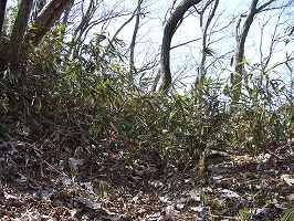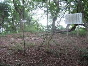 | 難台山頂。背後の部分を削って、国之常立命を祭った祠がある。山頂の主郭部は10m×30mほどの規模である。 | 主郭の東側には小規模な腰曲輪が3段ほどあり、堀切2につながっている。堀切といっても実際には、切岸を整形した際に、外側もちょっと削ったという程度で、外側の深さは1mほどもない。城塁側は3mほどの高さがある。 |
