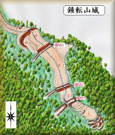 鐘転山城は、かなり古いタイプの山城と思われる城である。宍戸氏は南北朝から戦国時代にかけてこの地域を領していたというが、あるいはこの城は南北朝時代の城であるのかもしれない。遺構の雰囲気が南北朝の頃の古い山城のイメージと符合する。もっとも、逃げ込み所の詰めの城として、たいして手が加えられていないだけなのかもしれないが。