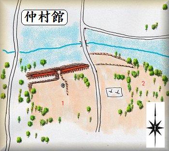 仲村館は、隠沢観音の東800mほどの所にある。八坂神社の南西700m、厳島神社の北西700mほどの所である。館跡の北側には池の跡がある。幅20m近くあり、近年まで、池としても用いられていたようだ。この先の微高地(2の部分)が館跡であるらしいのだが、特にそれらしい遺構は目に入ってこない。