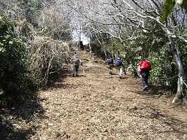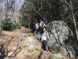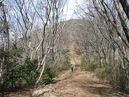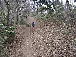 | 団子石峠の所に車を置いて登り出すとすぐに団子石が見えてくる。団子に見えるかな? それにしてもハイキングに来る人が結構多いようで、峠にも車が難題も留まっていた。 | 道は急に傾斜がきつくなってくる。写真ではよく分からないが、かなりきつい坂である。 |