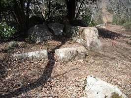ピーク1からさらに進んでいくと、平坦な尾根となり、途中に石がごろごろしている所がある。最初は自然に転がっている石かと思ったのだが、どう見ても人工的に切り出したとしか思えないような跡もある。どうもこれは切石の残骸なのではないだろうか。実際、帰りにここで休憩していた方にお話を伺ったら、「昔この山で切り石をしていたんだ、山の中腹には石を切り出した跡があるんだよ」というように言われた。確かにこの山、ちょっと掘れば石材はいくらでも取り出せそうな気がする。とはいえ、こんな所から石を切り出すのは大変だったろうなあ。ということになると、山道の脇に何ヶ所か見えた竪堀状の地形も、ひょっとして石を麓に下ろすためにつけられたものなのかもしれない。