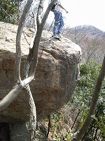 | 獅子岩の上から見た眺望。景色はとてもよい。はるか向こうに筑波山が見える。 | これがその獅子岩。獅子の鼻のように飛び出しており、先端まで行くと、下は空洞である。上に乗っていると気が付かないが、横から見るとちょっと怖い。 |