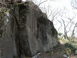 | 屏風岩。高さ6mほどある一枚岩である。この下の谷も岩で構成されており、かなりすごい。 | 屏風岩のあるところは、横から見ると堀切に見える。(堀切4) この反対側も竪堀となっている。 |