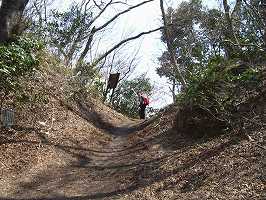 この郭をすぎると、大堀切が目に入ってくる。この城の遺構では最大規模のものであり、この堀切だけが大きいのがちょっと不思議である。深さは城内側で6mほどもあろう。堀底の幅も広く、幅10mほどの箱堀状になっている。遊歩道は堀底の西側を土橋状に通るようになっており、その脇には大規模な竪堀が掘られている。