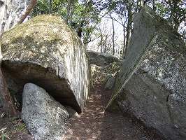 | さらに進んでいくと、岩が割れてできた天然の岩堀切があった。実際に虎口として使用されていた可能性もある。 | Bの南側辺りはちょっとした平場になっている。この右下には小さな平場がいくつかあるが、郭といえるのか、自然地形なのかなんとも言いがたい。 |