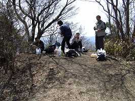 | ふと山頂に戻ってみると同行者たちがお昼の用意をしていた。私はもう少し、遺構を確認してこよう! | 主郭から北側に降りると、尾根の両脇を削っている部分がある。(堀切1) |