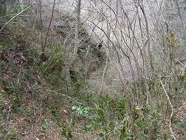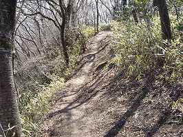 | Cの岩盤の谷。もちろん自然地形であるが、なかなか岩の竪堀がはるか下まで続いている壮観な光景である。 | 図の堀切5とした部分。ハイキングの道によって少し均されているが、もともとは堀切だったように見える。この部分と、少し北側とに竪堀のように見える地形もある。 |