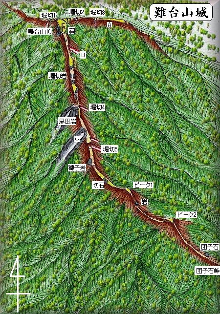 | (以前の記述)難台山城は岩間町と八郷町との間にまたがる標高553mの巨大な山塊である。この山の山頂から各峰にかけて、いくつかの城塞があったという。難台山城は南北朝時代の枢要な城の1つで、茨城県の県指定史跡となっている。 難台山城を築いたのは小田五郎藤綱で、南北朝時代さなかのことであった。藤綱は、小山若犬丸に味方して500人の兵を率いてこの城に籠もり幕府方に抵抗したという。城は要害で難攻不落、幕府方の度重なる攻撃にも絶え続けたが、しかし時勢は南朝方に味方してはくれなかった。幕府の命により佐竹氏が難台山城を包囲、佐竹氏は配下の小野崎道郷、江戸道高らに糧道を断たせ兵糧攻めを始めたので、やがて食料が尽き、さしもの要害もついに落城、藤綱は城を焼いて自害したという。 |