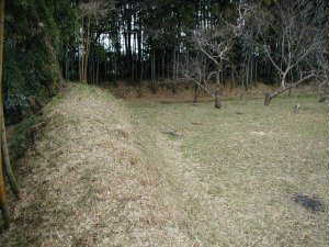 写真の土塁は南の中央方向辺りから西側を見た所で、西から北に伸びる土塁もよく見える。土塁は高いところで3mほどの高さがある。外側には堀があったであろうと思うのであるが、現在堀は埋められてしまったようである。西側の途中に土塁の切れがあり、これがあるいは虎口か? 土塁は南側の東半分は畑地となって崩されたらしく、消滅している。しかしこちらには、堀の跡ははっきりと残っている。大分埋まっているが、幅4mほどで、窪んでいる地形がよく見える。東側の土塁も消滅している。が、全体の構造を復元することは容易にできる。