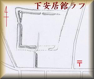 下安居館は、南川根郵便局の西200m、法音寺の北東200mほどの所にある。この辺りの道を走っていると、いやでも土塁が目に付いてくるので、すぐに館跡と知ることができる。郭内は一軒のお宅の敷地内となっていて、裏手の方までずかずかと入っていくことはできなかったのであるが、だいたいの構造を知ることはできた。基本的には100m×80mほどの方形の居館である。形がよく整っているので、中世も後期に入ってからの居館であるかもしれない。
