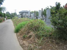 館跡は、県道280号線沿いの「いしだ設計」の辺りから北に600mほど入った辺りの比高10mほどの台地上にあった。この台地には写真のような土塁が随所に見られるのだが、いずれも断片的なもので、きちんとした館の形態を復元するのは難しい。この土塁も、台地縁のこの部分にだけ存在しているもので、どういう意味を持っていたのか理解しづらいものである。