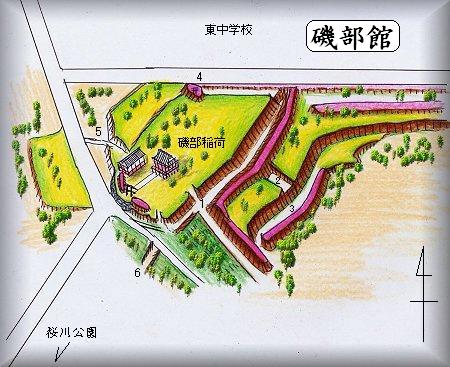 謡曲で有名な桜川神社の北にある磯部稲村神社の境内が館の跡である。台地の東南端辺りに位置しているのだが、西側の方から見ると平地に土を盛り上げた微高地上の居館のようにも見える。