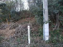 | 岩瀬高校との間の道に立っている標柱。ここから上ると土塁があるのだが、犬に吠えられる。城めぐりをしているとどこに行っても犬に吠えられる。犬が苦手な人は城めぐりでも苦労するだろうなあ。 | 1郭と2郭との間の堀切。深さは4mほど。左側が1郭で、土塁を2mほど盛り上げている。堀底には車が通った跡もあるので、後世、切り広げられている可能性もある。 |