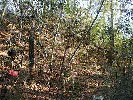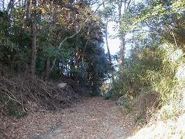 | これが標柱のある登り口。ここから上がっていけば10分もかからず、郭内に到達できる。 | 1郭南東側の堀。上りきった辺りから北東方面を見たところである左側が1郭である。 |