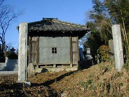 | 1郭と3郭との間にある堀切。ここは二重堀切になっている。深さはやはり4mほど。ヤブなので写真がうまく映らない。 | 3郭にあるお堂と墓地。この隣には鳥居があり、奥には祠が2つある。 |