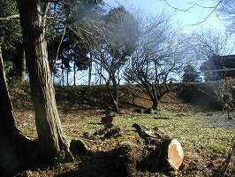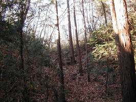| 3の横堀。この方向では二重堀となっていたようだ。 | 東中学校との間の部分。神社背後にあたる。もともと堀があったところであると思われるが、削れられてしまっている。 |