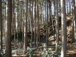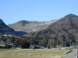 | (以前の記述)冨谷城は、標高365.1mの冨谷山の南側山麓にあった。この山は採石のためにすっかり崩されて、阿蘇山の外輪山のようになってしまっている。採石が城址近辺にまで及んでいるので、城の遺構もかなり破壊されてしまっているかもしれない。県道41号線の冨谷の交差点辺りから北側に入り、冨谷観音の方に行かずに東に曲がって、採石場の方向にむかう。その途中の道の東側に城址がある。この道はとにかくダンプがひっきりなしに来る。道は堀と泥水だらけである。 写真は郭の土手と堀の跡であると思われるが、どうもこの城は全体像がつかみにくい。道の脇に段々に郭が並んでいるようである。この郭の北側から東に入っていく道があるが、ここにはかなり大きな空堀が見られる。 冨谷城は、益子城の支城として益子氏が築き、城将として加藤氏を置いた。後、天正11年(1583)、百姓同士の境界争いから、益子氏と笠間氏の争いが起こり(冨谷合戦)、冨谷城の加藤大隈守らと、橋本城の谷中玄蕃とが戦ったという。当時、この富谷城と橋本城とが、益子、笠間の境界の城となっていたのである。 軍は始め益子方が有利だったが、やがて笠間方が盛り返し、冨谷城も落城したという。 |