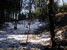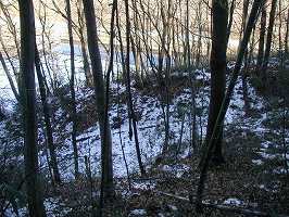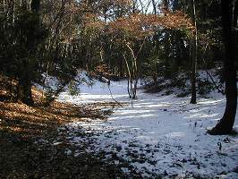 | 磯辺稲荷の参道。1月ということもあってか、本殿からは雅楽の演奏テープが流れていた。やはり神社に雅楽はよく似合う。しかし人は他に誰もいないのである・・・・。鳥居の両脇には土塁が残っている。 | 1の横堀。深さ3m、幅5mほどのものである。 |